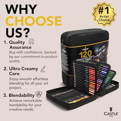 The Castle Art Supplies 120 Colored Pencils Zipper Case Set has been tested by studio experts to beat competitors and is trusted by over 1.5 million customers worldwide. Plus, it is backed by a unique money back PLUS guarantee for added peace of mind when purchasing this product.